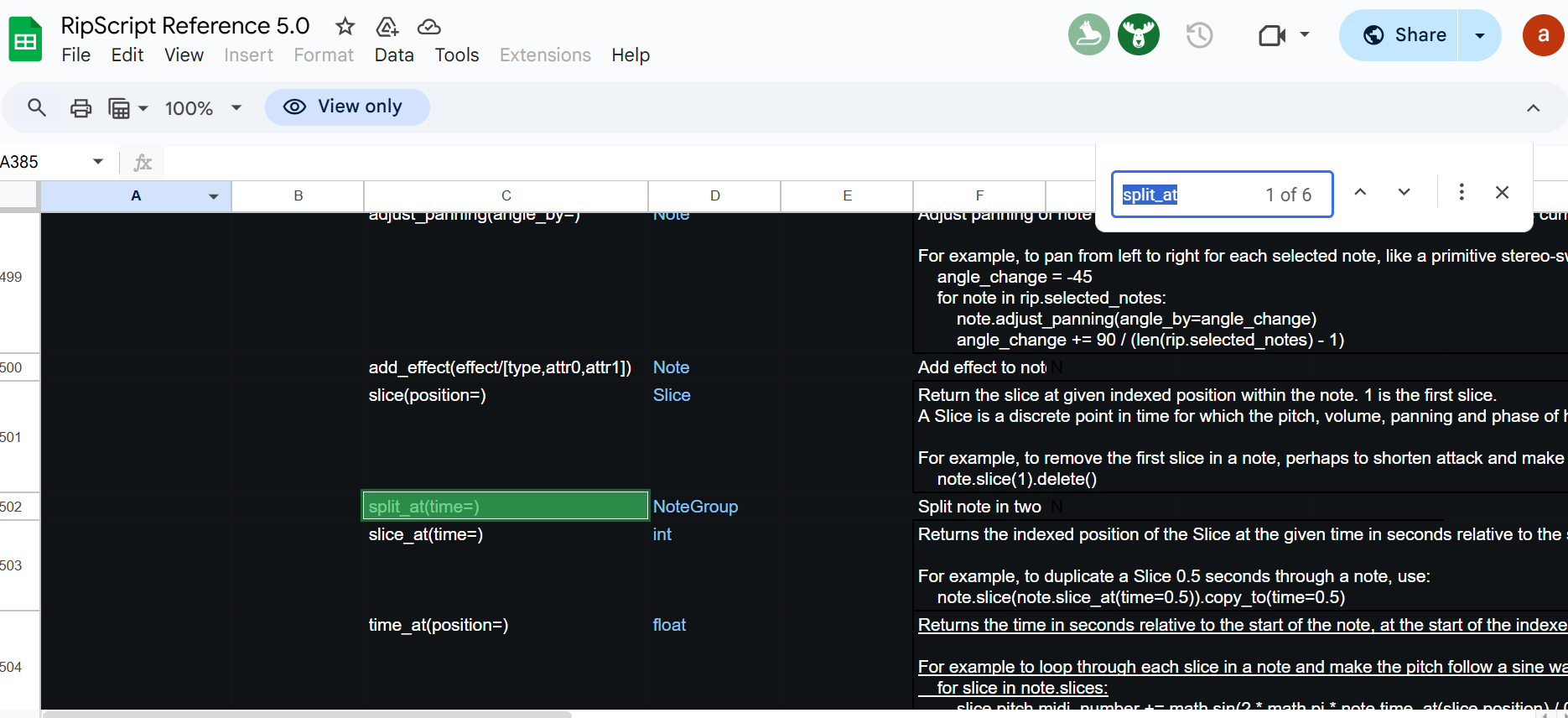 in the documentation there is a reference to a split_at method associated to a note object. However I cannot see it in the interactive help (intelisense) and when I invoke I get an error stating that the note object has no split_at attribute ...
