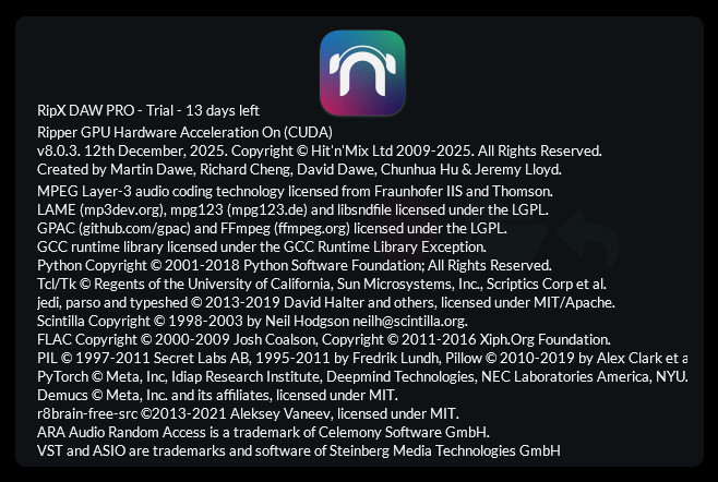 FLAC Copyright © 2000-2009 Josh Coalson. Copyright © 2011-2016 Xiph.Org Foundation. PIL © 1997-2011 Secret Labs AB, 1995-2011 by Fredrik Lundh, Pillow © 2010-2019 by Alex Clark et a PyTorch © Meta, Inc, Idiap Research Institute, Deepmind Technologies, NEC Laboratories America, NYU. Demucs © Meta, Inc and its affiliates, licensed under MIT. rbrain-free-src ©2013-2021 Aleksey Vaneev, licensed under MIT. ARA Audio Random Access is a trademark of Celemony Software GmbH. VST and ASIO are trademarks and software of Steinberg Media Technologies GmbH